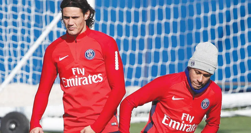 كافاني ونيمار في تدريبات سان جيرمان أمس (رويترز)