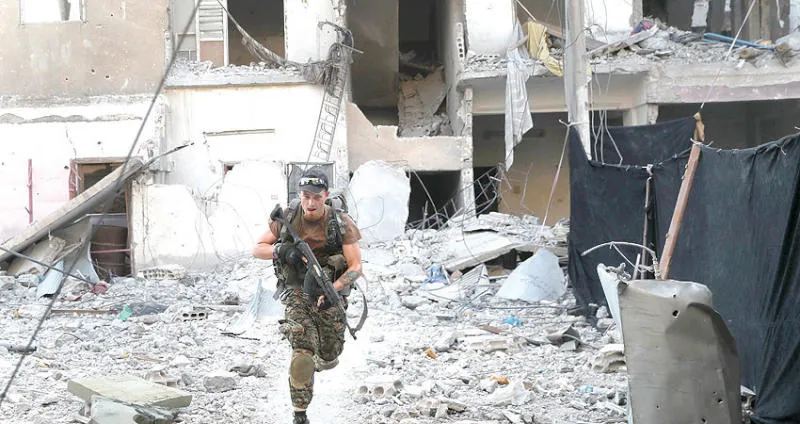 مقاتل من قوات سوريا الديمقراطية أمام مبنى مهدم في الرقة (أ.ب)