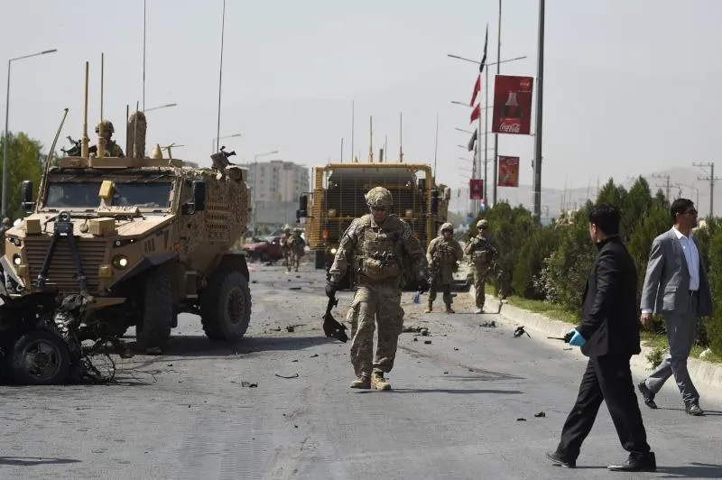 عناصر أمنية أفغانية إلى جانب جنود أميركيين يحققون في موقع تفجير السيارة المفخخة الذي استهدف قافلة تابعة لحلف شمال الأطلسي في كابل (أ.ف.ب)