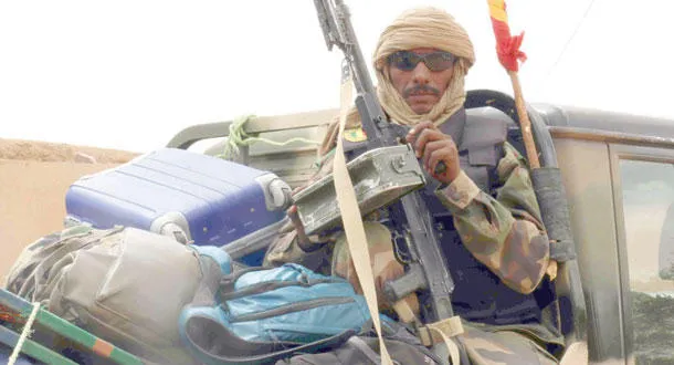 جندي من القوات المالية يرابط على مدخل مدينة كيدال بعد التوصل إلى اتفاق وقف إطلاق النار (أ.ف.ب)
