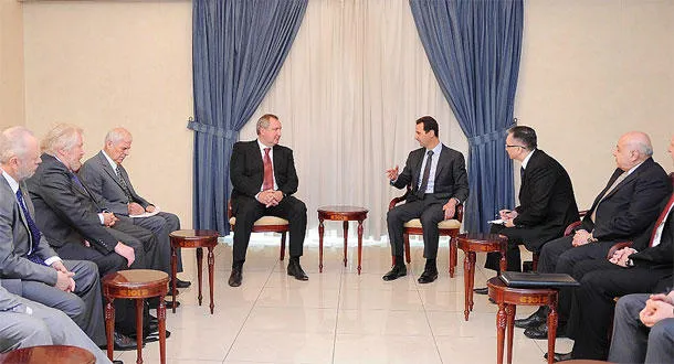 زار وفد حكومي روسي دمشق يوم أمس والتقى الرئيس بشار الأسد، الذي عبر عن «تقديره لمواقف روسيا، مشددا على أهمية الدور الروسي في حماية الاستقرار بالعالم والوقوف في وجه محاولات الغرب الهيمنة على دول المنطقة»، بحسب بيان رئاسي مقتضب لم يأت على ذكر مناسبة زيارة الوفد الروسي برئاسة ديمتري روغوزين نائب رئيس حكومة روسيا الاتحادية، مكتفيا بالإشارة إلى أن الحديث تناول «العلاقات الثنائية بين البلدين وأهمية توسيع آفاق التعاون القائم بينهما».