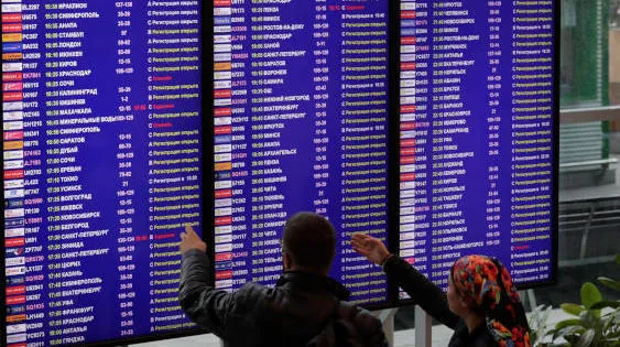 مسافرون في مطار دوموديدوفو قرب العاصمة الروسية موسكو (رويترز)