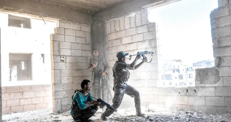 مقاتلون من «قوات سوريا الديمقراطية» خلال معارك الرقة امس (أ ف ب)