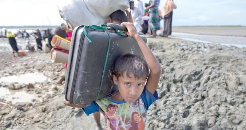 طفل من الروهينغا يتجه إلى مخيم في منطقة تكناف ببنغلاديش أمس (أ.ب)