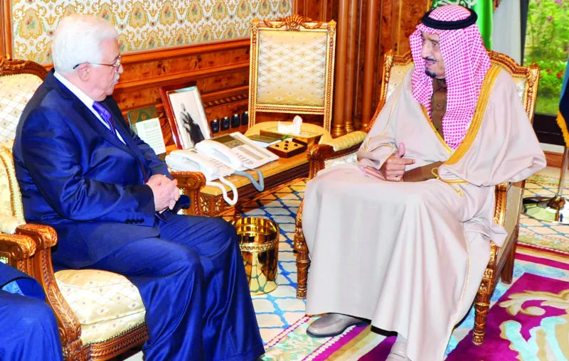 الأمير سلمان بن عبد العزيز خلال لقائه الرئيس الفلسطيني في المعذر أمس (واس)