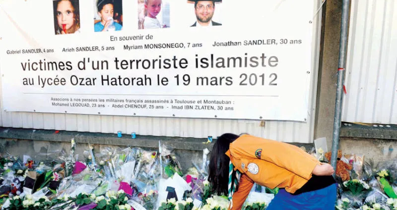 سيدة تضع باقات من الورود على أرواح ضحايا الهجوم الإرهابي الذي نفذه محمد مراح والذي قتل حاخاماً وثلاثة أطفال في مدرسة يهودية بمدينة تولوز عام 2012 (أ.ف.ب)