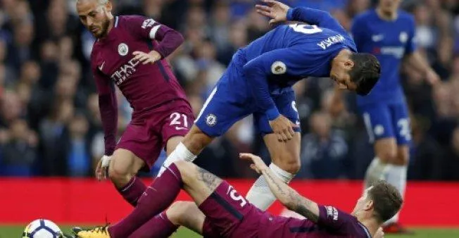 الإسباني ألفارو موراتا (في الوسط) في مباراة فريقه تشيلسي مع مانشستر سيتي في الدوري الإنجليزي (أ.ف.ب)