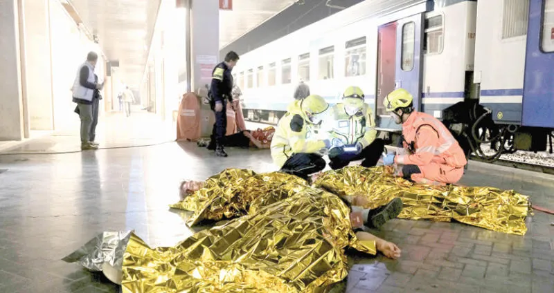 جانب من تدريبات لمكافحة الإرهاب في محطة قطار بمدينة البندقية أمس (رويترز)