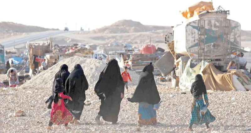 نازحون من المعارك بين «قوات سوريا الديمقراطية» وتنظيم {داعش} في منطقة عين عيسى قرب الرقة (رويترز)