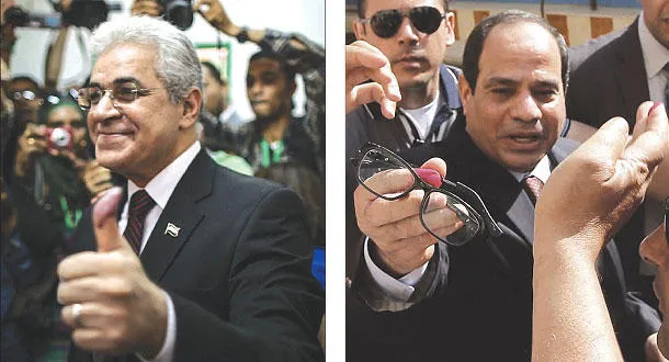 المرشح الرئاسي المشير عبد الفتاح السيسي خلال إدلائه بصوته أمس في لجنته غرب القاهرة.. والمرشح حمدين صباحي محييا أنصاره عقب الإدلاء بصوته في حي المهندسين بالجيزة (أ.ف.ب) (رويترز)