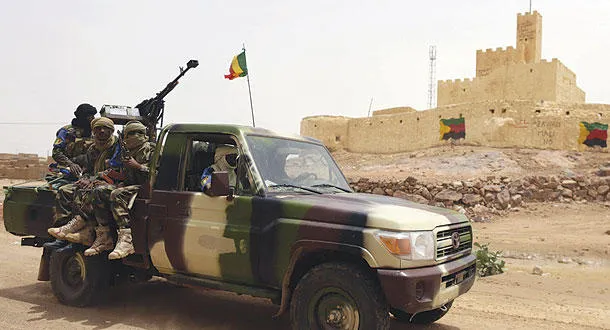 جنود ماليون يقومون بحراسة مدخل مدينة كيدال بعد الأحداث الدامية الأخيرة التي شهدتها المدينة (أ.ف.ب)