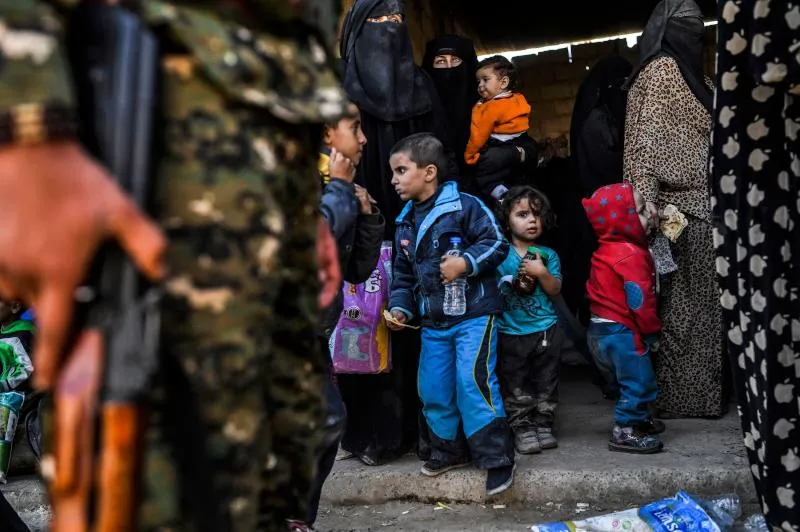 نساء وأطفال يتجمعون على الجبهة الغربية بعد فرارهم من مركز الرقة (أ.ف.ب)