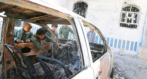 إحدى السيارات التي تضررت نتيجة قتال الجيش ضد القاعدة شمال صنعاء (رويترز)