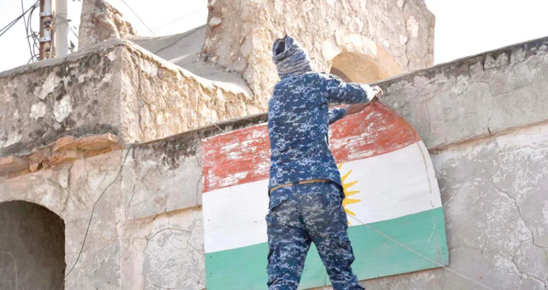 عنصر في الشرطة الاتحادية العراقية يزيل علم كردستان من مبنى في آلتون كوبري في أقصى شمال محافظة كركوك أمس (أ.ف.ب)
