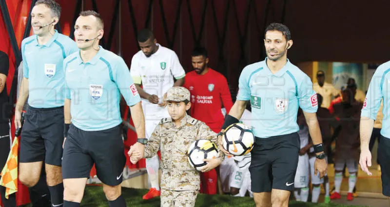 الطفل علي شويهي بصحبة حكام مباراة {الديربي} في طريقهم إلى الملعب (تصوير: سلمان مرزوقي)