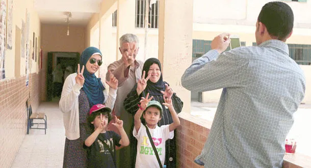 أحد موظفي لجنة اقتراع بالقاهرة يلتقط صورة تذكارية لأسرة مصرية عقب إدلائها بأصواتها أمس (أ.ب)