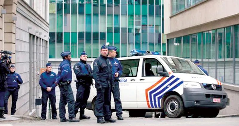 رجال الشرطة البلجيكية بالقرب من مقر محكمة بروكسل («الشرق الأوسط»)