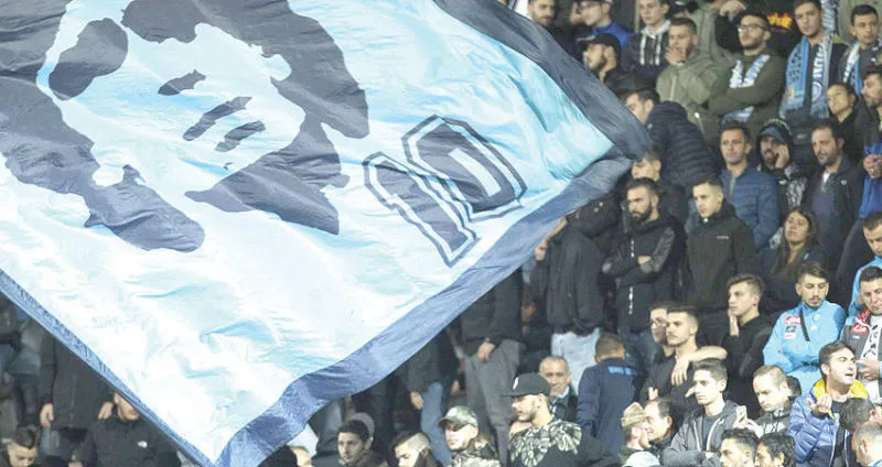 جماهير نابولي ترفع صورة الأسطورة مارادونا على أمل الفوز بالدوري هذا الموسم (أ.ف.ب)
