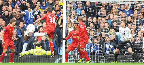 لوكاكو نجم هجوم إيفرتون (رقم 17 يسار) يسدد برأسه محرزا هدفه الثاني، والثالث لفريقه في مرمى ليفربول (إ.ب.أ)