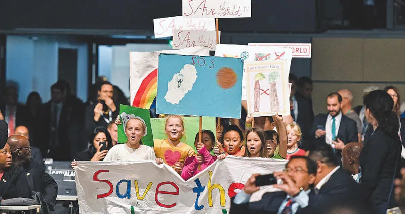 أطفال يحملون لافتات تدعو إلى إنقاذ العالم في افتتاح قمة المناخ الـ23 في بون أمس (أ.ب)