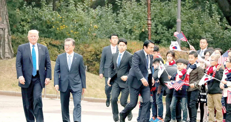 وفي وقت يسود فيه القلق في سيول التي تقع في مرمى مدافع الشمال، طلب مون من واشنطن عدم شن عملية عسكرية ضد بيونغ يانغ من دون الحصول على موافقة مسبقة من بلاده. رغم ذلك، نظمت سيول استقبالاً حافلاً لترمب، في سعيها للحصول على ضمانات بشأن متانة التحالف الثنائي رغم شخصية الرئيس الأميركي الذي توعد بيونغ يانغ بـ«النار والغضب».