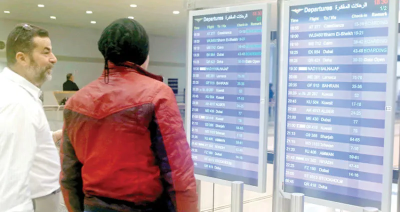 مسافرون يدققون في شاشة حركة الطائرات بمطار بيروت الدولي أمس (رويترز)
