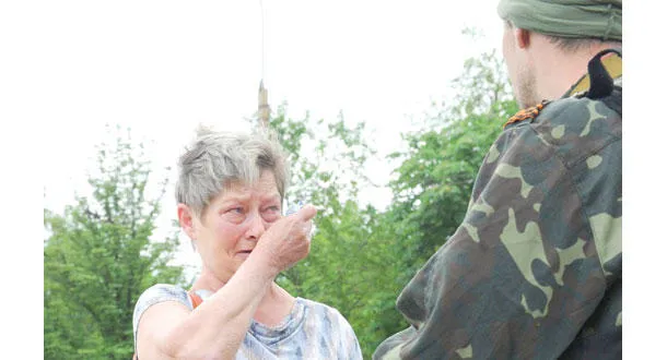 امرأة تبكي أثناء حديثها لمسلح موال لروسيا عند نقطة تفتيش في مدينة دونيتسك بشرق أوكرانيا أمس (أ.ف.ب)