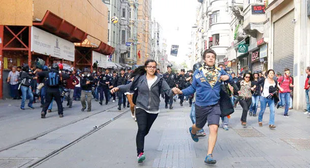 الشرطة التركية تطارد شبابا في شارع الاستقلال القريب من ساحة تقسيم وسط إسطنبول أمس (إ.ب.أ)