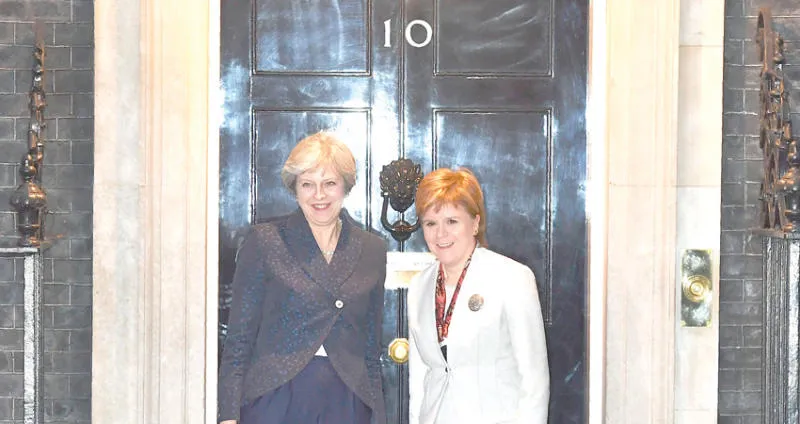 تيريزا ماي مع رئيسة وزراء اسكتلندا نيكولا ستيرجن أمام مقر رئاسة الوزراء في لندن (أ.ف.ب)