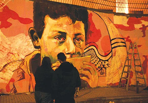مصريان يشاهدان جدارية لإحياء ذكرى ضحايا العنف في شارع محمد محمود وسط القاهرة أمس (رويترز)