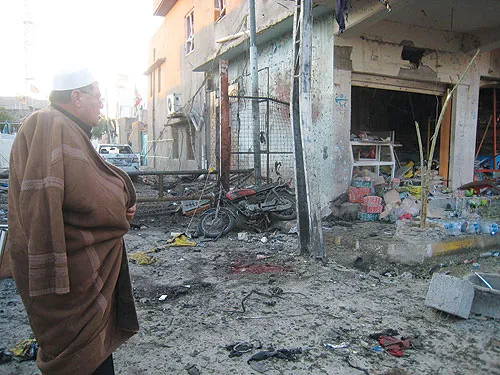 عراقي يعاين أمس آثار تفجير انتحاري شهدته بلدة طوز خورماتو أول من أمس (أ.ف.ب)