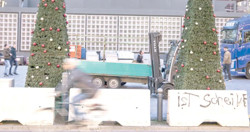 سواتر خرسانية تحيط بموقع ستقام فيه سوق لأعياد الميلاد بالعاصمة الألمانية برلين وسط مخاوف من عمليات إرهابية (إ.ب.أ)