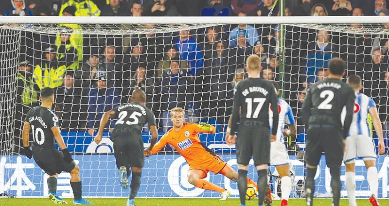 أغويرو نجم مانشستر سيتي (يسار) يسجل من ركلة الجزاء في مرمى هيدرسفيلد (رويترز)