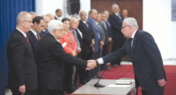 عباس يصافح وزير الخارجية خلال تأدية حكومة التوافق الفلسطينية اليمين أمامه في رام الله أمس (أ.ب)