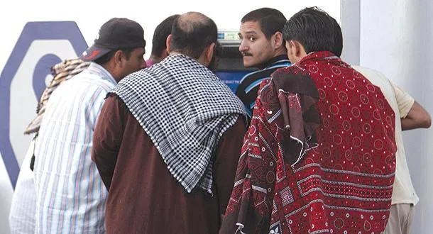 يقوم أحد هؤلاء العمال بحوالات بنكية لصالح عمال عجزوا عن فتح حسابات خاصة لهم كونهم يعملون بصورة غير نظامية وهو جزء من الاقتصاد الخفي (تصوير: خالد الخميس)