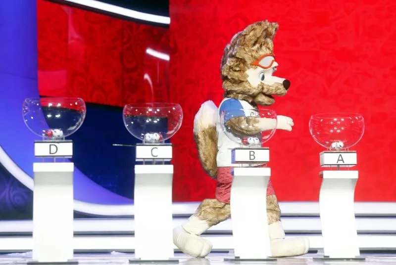الذئب زابيفاكا تميمة مونديال روسيا 2018 خلال القرعة التجريبية للبطولة (إ.ب.أ)