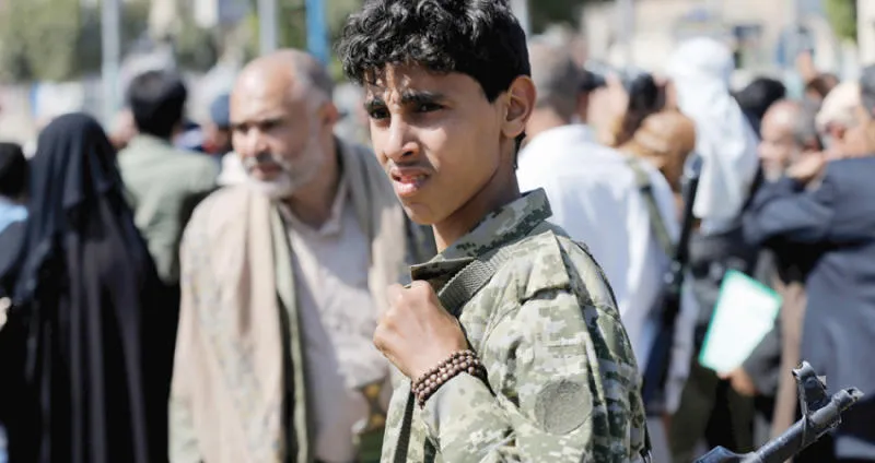 طفل يحارب بصفوف ميليشيات الحوثي في صنعاء أمس (رويترز)