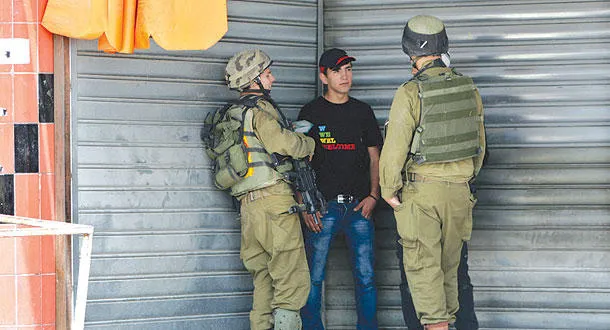 جنديان يستجوبان فلسطينيا في نابلس أمس (أ.ب)