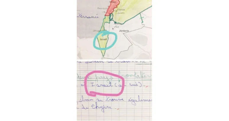 وانتشرت في مواقع التواصل الاجتماعي صورة لخريطة لبنانية تدرس في حصة «الجغرافيا الفرنسية» في مدرسة فرنسية في بيروت، تظهر أن إسرائيل تحد لبنان جنوباً بدلاً من فلسطين، وهو ما يحظره القانون اللبناني بالنظر إلى أنه لا يعترف قانوناً بإسرائيل، ويكافح اعتماد مصطلح «إسرائيل» لكونه يعد «تطبيعاً» مع الدولة العبرية.