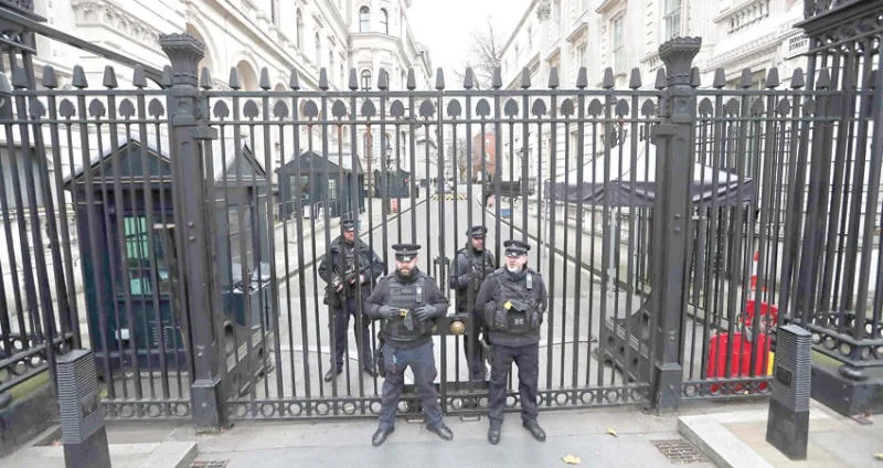 شرطيون أمام البوابات المؤدية إلى مقر رئاسة الوزراء في 10 داونينغ ستريت في لندن أمس (أ.ف.ب)