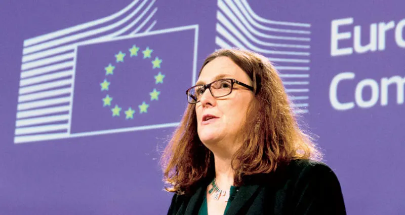 المنسقة الأوروبية للتجارة سيسيليا مالماسترم أثناء مؤتمر صحافي حول الشراكة الاقتصادية بين اليابان والاتحاد الأوروبي في بروكسل (إ.ب.أ)