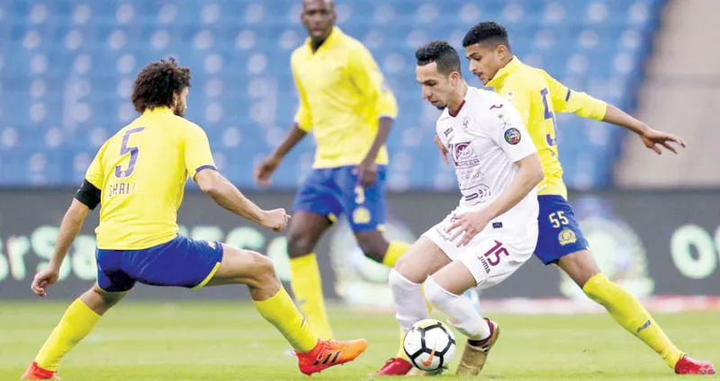 جانب من مواجهة فريقَيْ النصر والفيصلي في الرياض أمس («الشرق الأوسط»)