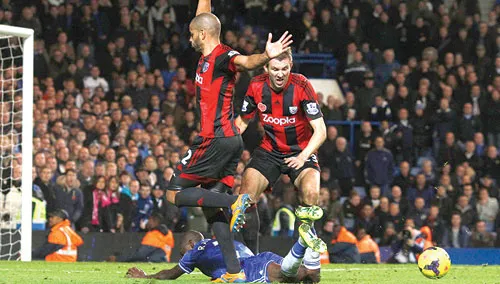 راميريز لاعب نادي تشيلسي على الأرض ادعى العرقلة وفاز بركلة جزاء خلال مباراة فريقه ضد وست بروميتش