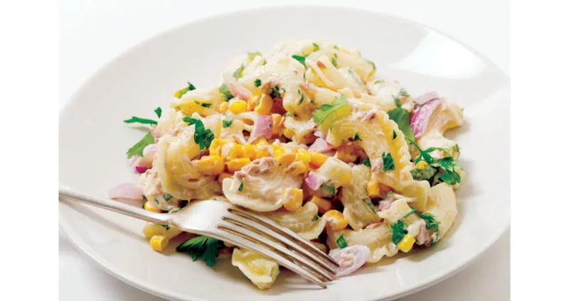 السلطة من الأطباق اللذيذة والصحية، ومن الممكن إضافة بعض المكونات لجعلها طبقاً كاملاً ومتكاملاً، ففي هذه الوصفة يتم الاعتماد على المعكرونة، لتصبح السلطة طبقاً رئيسياً وسريع التحضير بنفس الوقت. المكونات معكرونة (على شكل صفد) 500 غرام تونة معلبة ذرة معلبة ملعقتان مايونيز (كبيرة الحجم) ملعقتان ليمون ملح بهار
