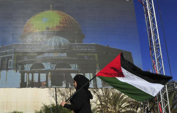 جزائرية تحمل علم فلسطين خلال مظاهرات في العاصمة الجزائرية احتجاجاً على قرار ترمب. (ا.ب)