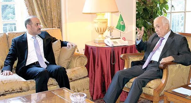 نبيل العربي اثناء اجتماعه رئيس «الائتلاف» السوري المعارض بالقاهرة أمس (أ.ف.ب)
