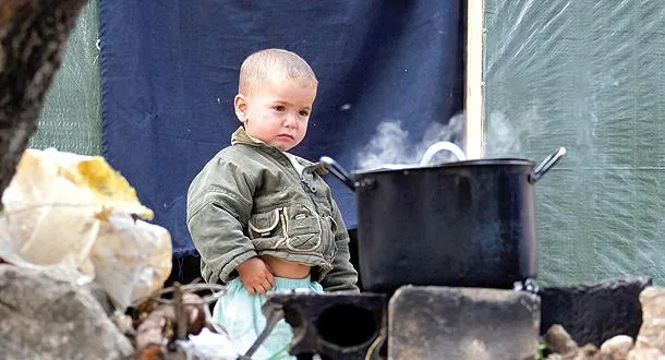 طفل سوري من اللاجئين الذين قدموا من حلب يقف إلى جانب طنجرة طبخ، في أحد الملاجئ بلبنان، أمس (إ.ب.أ)