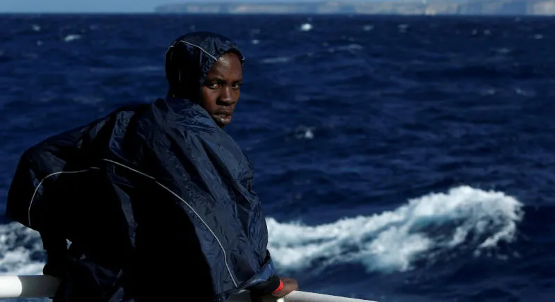 مهاجر يقف على سطح سفينة بعد عملية إنقاذ قبالة السواحل الليبية (رويترز)