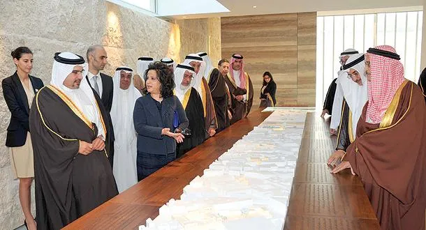 الأمير سلمان بن حمد آل خليفة، ولي العهد البحريني، أثناء تدشينه مركز معلومات قلعة أبو ماهر، وتبدو في الصورة وزيرة الثقافة مي بنت محمد آل خليفة وهي تشرح تفاصيل المشروع («الشرق الأوسط»)