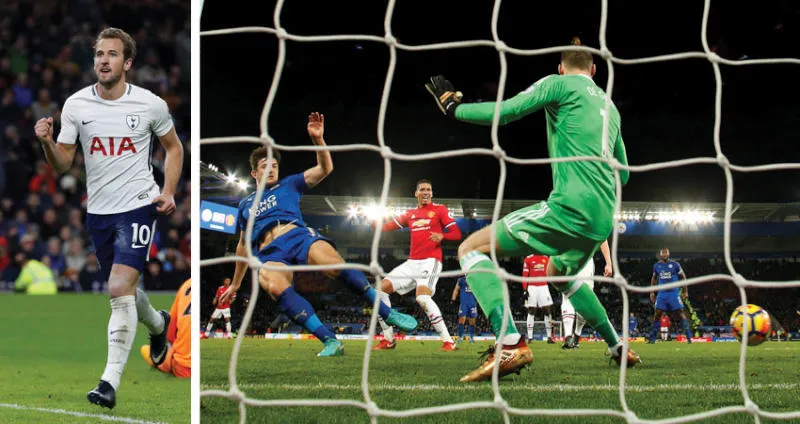 ماغواير لاعب ليستر (يسار) يسجل في مرمى دي خيا ليحرم يونايتد من الفوز (رويترز)  -  كين في حاجة لهدف واحد لتحقيق رقم قياسي في التهديف (رويترز)